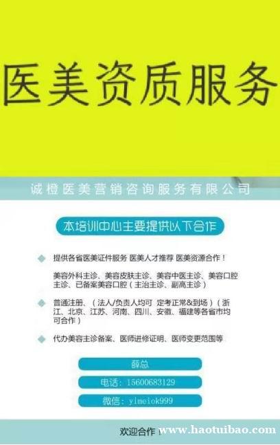 四、各省美容主诊(全部已经美容主诊备案)满6副高资质资源合作,美容主诊包括美容外科副高、美容皮肤副高、美容口腔副高、美容中医副高,可提供证件资质、可做法人、可做负责人,可配合到场验收。