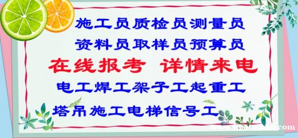 专业:土建施工员、市政施工员、装饰施工员、暖通工程施工员、土建质量员、装饰质量员、暖通质量员、市政质量员、材料员、机械员、资料员、标准员、取样员、预算员、试验员、档案员、商务管理员等 建筑机械塔吊 施工电梯 信号工 电工焊工同步招生中